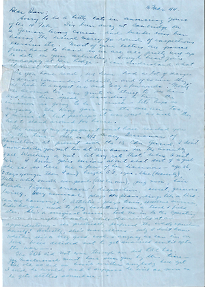 The news of my engagement must have reached you by this time. She is N/S Mary Freeman of Hamilton. At present with the 13 Canadian General. I don’t know whether you met her at our dance in the assembly Worthing or not? At any rate that’s where I met her. I know you’re curious about what sort of a girl she is so here are few of the dimensions – age 26 (5 days younger than I am) height 5.3, eyes blue (heavenly) teeth, white smooth even pearls (all her own) pug nose, hair blond. Figure erraaow! Disposition – sweet generous loving. Very musical, plays the piano, sings like a bird, can we harmonize! Athletic, plays tennis excellent swimmer rides horses, used to play ? and was a track and field star. She’s a surgical nurse , took me in the operating room one night to watch while she assisted at an appendectomy, she practically performed the whole operation herself. Honestly, she’s marvellous. Only I don’t know if she is a very good cook – anyway we can live on love. We’ve decide not to get married until after the war.