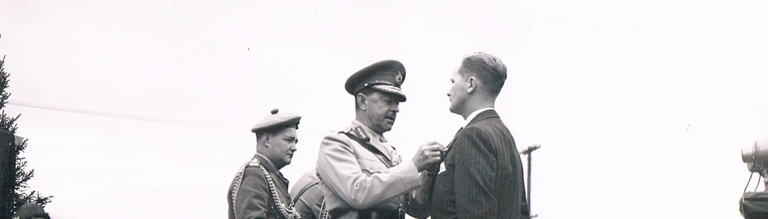 Major Styffe joined the Lake Superior Regiment (Motor) at Soliers near Caen, where he commanded the Scout Platoon `C’ Company. Rapidly he rose to command the Company and led it across France, Belgium, Holland and Germany. Throughout, he exhibited powers of leadership and an unshakable resolve to close with the enemy which established a standard of conduct among all ranks of his Company. On one occasion, in the Battle of the Scheldte, he was in charge of a force of commandeered small craft which assaulted German naval units and shore installations. He landed on a small island west of Sluis and pressed in with his Company against the heavily defended dock area, killing eighty Germans, taking four prisoners and causing an additional hundred to withdraw hastily to the west. During this whole action and particularly at the critical moment of touching down, Major Styffe showed a complete disregard for his personal safety, exhorting his men to superhuman efforts by his own magnificent example.